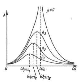 Амплитуда вынужденного колебания (1.7.39) прямо пропорциональна амплитуде вынуждающей силы и имеет сложную зависимость от коэффициента затухания среды и круговых частот собственного и вынужденного колебания. Если ω0 и β для системы заданы, то амплитуда вынужденных колебаний имеет максимальное значение при некоторой определенной частоте вынуждающей силы, называемой резонансной. Само явление – достижение максимальной амплитуды для заданных ω0 и β – называют резонансом.