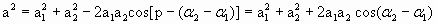 Вектор а является суммой векторов а1 и а2. Проекция вектора а на ось Х равна сумме проекций векторов а1 и а2: х=х1 + х2. Следовательно, вектор а представляет собой результирующее колебание. Этот вектор вращается с той же угловой скоростью, что и векторы а1 и а2. Таким образом, результирующее движение представляет собой гармоническое колебание с частотой ω0, амплитудой а и начальной фазой α. Используя теорему косинусов, находим значение амплитуды результирующего колебания: