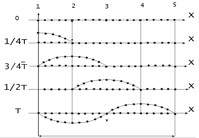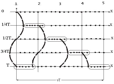 1.7.11. Распространение волн в упругой средеЕсли в каком-либо месте упругой (твёрдой жидкой или газообразной) среды возбудить колебания её частиц, то вследствие взаимодействия между частицами это колебание будет распространяться в среде от частицы к частице с некоторой скоростью υ. процесс распространения колебаний в пространстве называется волной. Частицы среды, в которой распространяется волна, не вовлекаются волной в поступательное движение, они лишь совершают колебания около своих положений равновесия. В зависимости от направлений колебаний частиц по отношению к направлению, в котором распространяется волна, различают продольные и поперечные волны. В продольной волне частицы среды колеблются вдоль распространения волны. В поперечной волне частицы среды колеблются в направлениях, перпендикулярных к направлению распространения волн. Упругие поперечные волны могут возникнуть лишь в среде, обладающей сопротивлением сдвигу. Поэтому в жидкой и газообразной средах возможно возникновения только продольных волн. В твёрдой среде возможно возникновение как продольных, так и поперечных волн. На рис. 1.7.12 показано движение частиц при распространении в среде поперечной волны. Номерами 1,2 и т. д. обозначены частицы отстающие друг от друга на расстояние, равное (¼ υT), т.е. на расстояние, проходимое волной за четверть периода колебаний, совершаемых частицами. В момент, времени принятый за нулевой, волна, распространяясь вдоль оси слева направо, достигла частицы 1, вследствие чего частица начала смещаться из положения равновесия вверх, увлекая за собой следующие частицы. Спустя четверть периода частица 1 достигает крайнего верхнего положения равновесия частица 2. По пришествие ещё четверти периода первая часть будет проходить положение равновесия, двигаясь в направлении сверху вниз, вторая частица достигнет крайнего верхнего положения, а третья частица начнёт смещаться вверх из положения равновесия. В момент времени равный T, первая частица закончит полный цикл колебания и будет находиться в таком же состоянии движения, как чальный момент. Волна к моменту времени T, пройдя путь (υT), достигнет частицы 5. На Рис. 1.7.13 показано движение частиц при распространении в среде продольной волны. Все рассуждения, касающиеся поведения частиц в поперечной волне, могут быть отнесены и к данному случаю с заменой смещений вверх и вниз смещениями вправо и влево. Из рисунка видно, что при распространении продольной волны в среде создаются чередующиеся сгущения и разряжения частиц (места сгущения обведены на рисунке пунктиром), перемещающиеся в направлении распространения волны со скоростью υ.