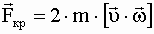 равна произведению удвоенной массы тела на векторное произведение скорости поступательного движения тела относительно системы отсчета и угловой скорости вращения системы отсчета. Эта сила направлена перпендикулярно векторам скорости тела и угловой скорости вращения системы в соответствии с правилом правого винта.
