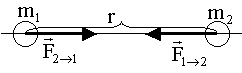 где - гравитационная постоянная. Из формулы видно, что величина гравитационного взаимодействия не зависит от среды, в которой находятся взаимодействующие тела, гравитационное взаимодействие существует и в вакууме. На рисунке1.8.1 изображено направление сил гравитационного взаимодействия двух материальных точек.