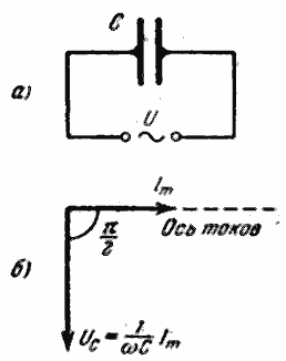 Пусть переменное напряжение подано на емкость С (Рис.3.9.3) Индуктивностью и сопротивлением подводящих проводов пренебрегаем. Емкость непрерывно перезаряжается, благодаря чему через нее протекает переменный ток. Напряжение на конденсаторе можно считать равным внешнему напряжению: