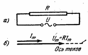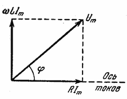 Удобно при описании переменных токов использовать векторные диаграммы. Выберем произвольное направление, которое назовем осью токов. Отложим вдоль этого направления вектор тока длиной Im. Поскольку напряжение и ток в данном случае изменяются во времени синхронно, вектор напряжения также будет направлен вдоль оси токов. Его длина равна RIm.