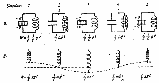 Из сопоставления электрических и механических колебаний следует, что энергия электрического поля аналогична потенциальной энергии упругой деформации, а энергия магнитного поля аналогична кинетической энергии. Индуктивность L играет роль массы m, величина, обратная емкости С-1, - роль коэффициента жесткости k. Наконец, заряду q соответствует смещение маятника х, а силе тока - скорость.