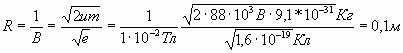 Пример 9. Электрон, пройдя ускоряющую разность потенциалов 89кВ, влетает в однородное магнитное поле перпендикулярно его линиям индукции. Индукция поля равна 0,01Тл. Определить радиус траектории электрона.