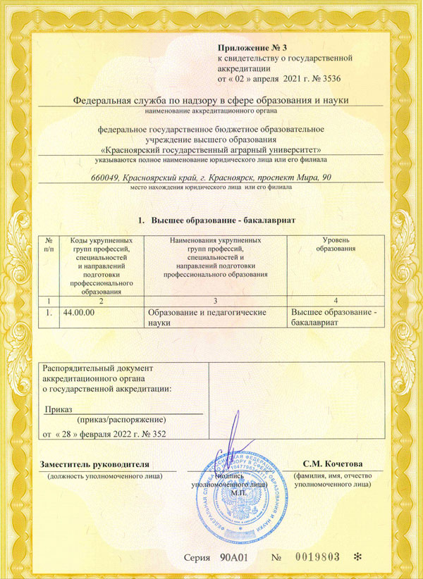 Приложение № 3 к СВИДЕТЕЛЬСТВУ о государственной аккредитации от "02" апреля 2021 г. Регистрационный № 3536 Серия 90А01 № 0019803