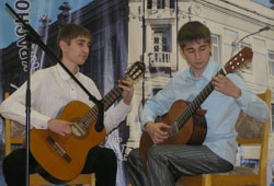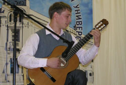 На нашем фестивале состоялся настоящий дебют студентки института международного менеджмента и бизнеса Татьяны Полуяновой, которая вышла на сцену впервые с песней из репертуара Натальи Власовой «Я у твоих ног». С особым вниманием зрители наблюдали яркое, темпераментное исполнение на гитаре «Испанского танца» Андреем Даниловым (ИАЭМ). Гитаристы братья близнецы Павел и Петр Зыряновы (ИУИС) сорвали громкие аплодисменты. ![]()