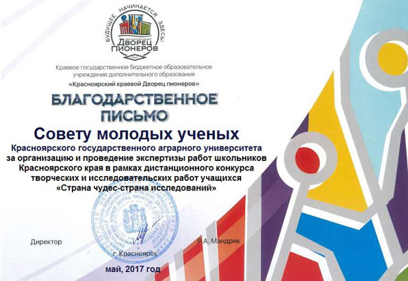 Молодые ученые Красноярского государственного аграрного университета приняли участие в организации и проведении экспертизы работ школьников Красноярского края в рамках дистанционного конкурса творческих и исследовательских работ учащихся «Страна чудес – страна исследований». Из нескольких десятков исследований школьников по различным направлениям молодые эксперты из состава СМУ (Белых И.Н., Юферев С.С., Савинич Е.А., Миронов А.Г.) отобрали самые достойные для публикации в сборнике научных работ и получения дипломов. За большую проделанную работу Совет молодых ученых получил благодарственное письмо организатора конкурса – Красноярского краевого Дворца пионеров и приглашение к дальнейшему сотрудничеству.