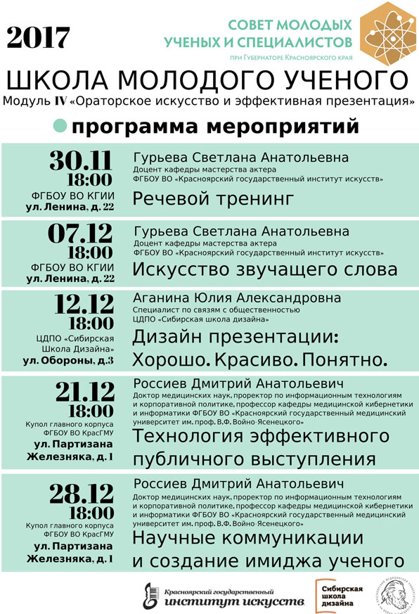 10-12 апреля 2018 года город Красноярск принимает более 100 молодых ученых, преимущественно председателей Советов молодых ученых, из 25 регионов России. В центре внимания вопросы развития науки глазами молодых ученых, интеграция научной деятельности и организация сетевого взаимодействия Советов молодых ученых различных городов и организаций в повышении качества, эффективности и междисциплинарности научных исследований. Обсуждение актуальных вопросов будет проходить в рамках круглых столов и секций трех крупных мероприятий: Съезда Советов молодых ученых и специалистов Уральского, Сибирского и Дальневосточного федеральных округов; расширенного совещания Совета молодых ученых аграрных вузов Сибирского и Дальневосточного федеральных округов; Международной научно-практической конференции молодых ученых «Инновационные тенденции развития российской науки».