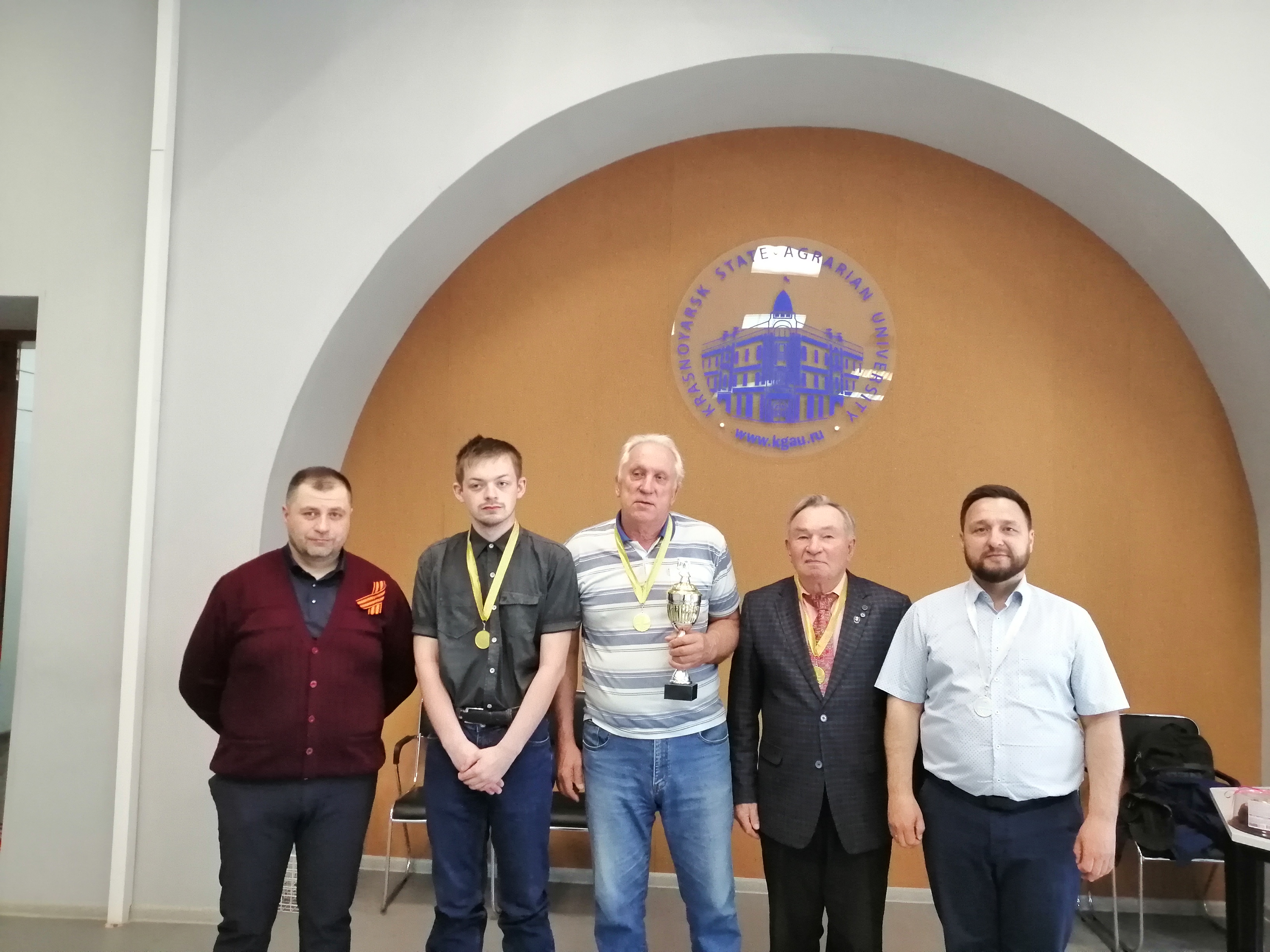 Капитан команды КрасГАУ по шахматам к.т.н., доцент Васильев Александр Александрович в центре с кубком ИИСЭ, справа д.б.н., профессор Смолин Сергей Григорьевич ИПБ и ВМ и аспиранты Института экономики и управления АПК.
