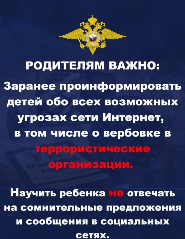 «МВД России предупреждает о массовых попытках вовлечь молодёжь в преступления. Провокаторы пользуются ситуацией после трагедии в «Крокусе» и склоняют молодежь к террористической деятельности. Преступники анализируют страницы в соцсетях и выбирают жертв, имеющих религиозные, психологические или иные проблемы и убеждения. Родители, не теряйте бдительность! Предупредите своих детей о таких сообщениях и расскажите, куда обратиться. Подробнее информация в карточках от МВД».