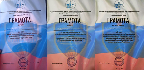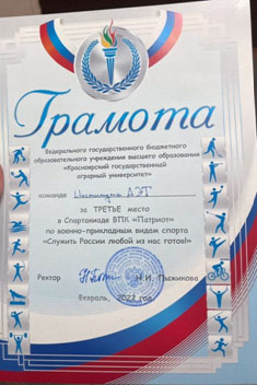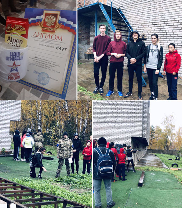 21 февраля прошла военно-спортивная игра «Честь имею!» в рамках празднования Дня защитника отечества. Команда нашего института в составе: Хроник Анна, Гурьянов Максим, Корень Егор, Мухин Александр, Чазов Михаил и Березина Полина, приняли активное участие в мероприятии и заслужили Благодарственное письмо от ректора университета. Игра состояла из следующих этапов: метание гранаты, интеллектуальный этап, надевание противогаза, минное поле, стрельба, неполная разборка-сборка автомата, медицинская помощь, эвакуация раненого, контакт с противником. Этапы были достаточно сложные, но интересные, дающие возможность испытать свою силу и ловкость.