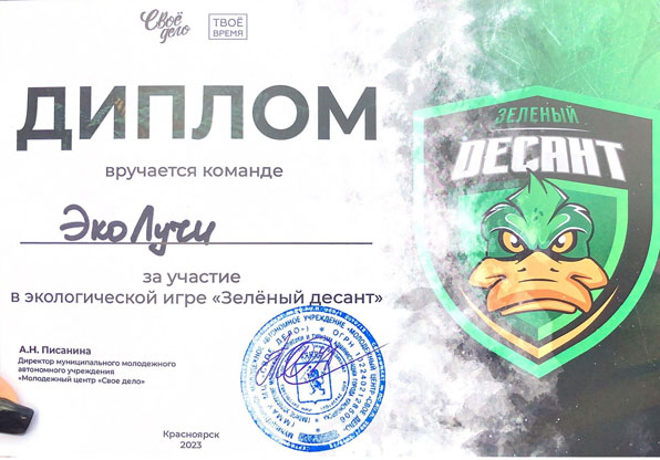 23 сентября студенты группы А 31-22о Варганова Диана, Дымченко Евгения, Жигалина Юлия, Логутенкова Полина, Титова Екатерина приняли участие в мероприятии "Зеленый десант", организованном Молодежным центром "Свое дело". Девушки в составе команды "ЭкоЛучи" приняли участие в сборе мусора в Ленинском районе г. Красноярска.