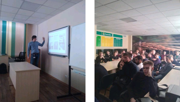 По приезду на предприятие студентов радушно встретили работники производства, в том числе директор по производству. В первую очередь провели знакомство с компанией. Студентам была представлена небольшая ознакомительная презентация о компании, её регионе присутствия, видах деятельности, партнёрах, а также список актуальных вакансий компании.