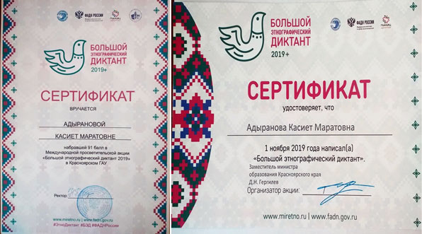 Поздравляем Адыранову Касиет, студентку 2 курса направления подготовки 35.03.07 «Технология производства и переработки сельскохозяйственной продукции» ИПБиВМ, с получением двух сертификатов: - набравшей 91 балл в Международной просветительской акции «Большой энтографический диктант 2019»; – «Сертификат участника», который проходил на базе ФГБОУ ВО «Красноярский ГАУ».