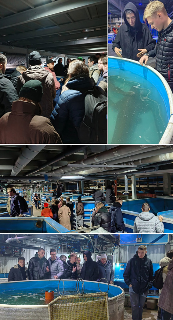 В рамках экскурсии студентам рассказали об истории компании, основной деятельности, показали методы разведения, выращивания и реализацией рыбной продукции.