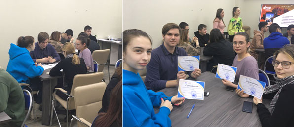 От нашего института выступили две команды по 5 человек: Абросимов Роман, Сюськина Александра, Величко Анастасия, Гордейчук Дарья, Попов Сергей, Трифонова Алина, Беленькая Жанна, Завацкая Анастасия, Федорова Мария, Мельникова Ирина. Ребята призовых мест не заняли, но получили массу положительных эмоции от мероприятия.