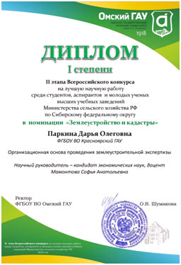 Решением конкурсной комиссии 1 место и рекомендацию для участия в III этапе Всероссийского конкурса на лучшую научную работу среди студентов, аспирантов и молодых ученых в номинации «Землеустройство и кадастры» получила студентка 2 курса магистратуры ИЗКиП ФГБОУ ВО Красноярский ГАУ Паркина Дарья Олеговна. Научный руководитель Мамонтова Софья Анатольевна, канд. экон. наук, доцент кафедры землеустройства и кадастров.