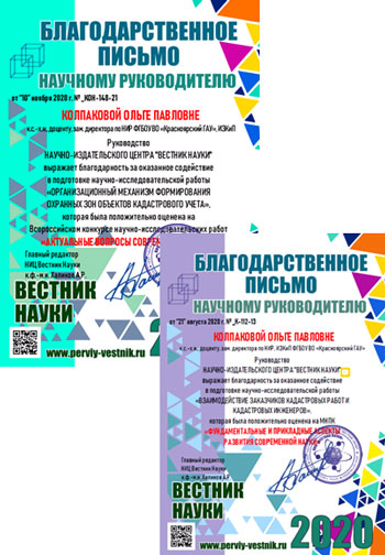 Руководство «Научно-издательского центра «ВЕСТНИК НАУКИ», в лице главного редактора к.ф.-м.н. Халикова А.Р. выражает благодарность к.т.н., доценту Еруновой Марине Геннадьевне, за оказанное содействие в подготовке научно-исследовательской работы «Информационное обеспечение для мониторинга арендаторов лесных хозяйств Российской Федерации», которая была положительно оценена на МНПК «Цели и пути устойчивого экономического развития».