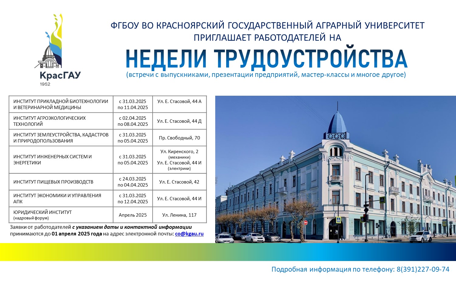 27 апреля 2023 года проводилось мероприятия с главным менеджером АН «Доступное жилье» Соловьёвой Светланой. Мероприятие организовали преподаватели кафедры «Кадастр застроенных территорий и геоинформационные технологии» для студентов третьего курса по направлению подготовки 21.03.02 «Землеустройство и кадастры», в котором поучаствовали 30 студентов третьего курса обучения. Темой данного мероприятия была «Рынок недвижимости в Красноярске. Прогнозы, перспективы и развитие рынка недвижимости». На данном мероприятии рассматривались вопросы дальнейшего сотрудничество, в области практического обучения, в области экскурсионных мероприятий, а так же дальнейшего трудоуйстройства.