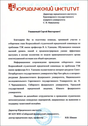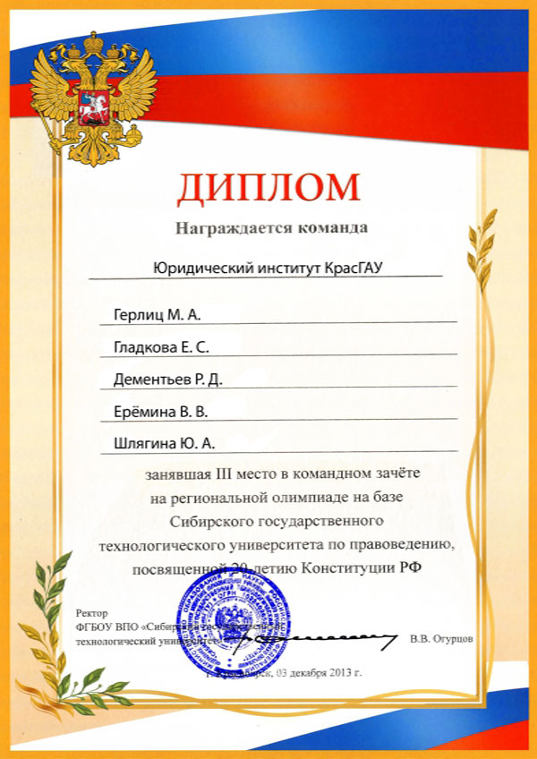 03 декабря 2013г. состоялась региональная олимпиада, посвященная 20 летию Конституции РФ, на базе Сибирского государственного университета по направлению. Студенты Юридического института Красноярского государственного аграрного университета приняли участие в командном зачёте, где заняли почетное 3 место.