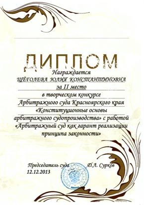 Ворое место поделили работа Щеголевой Юлии Константиновны (Юридический институт ФГБОУ ВПО КрасГАУ / 4 курс) на тему «Арбитражный суд как гарант реализации принципа законности» и работа Кухарчик Анастасии Ивановны (Юридический институт ФГБОУ ВПО КрасГАУ / 4 курс) на тему «Амнистия 2013 к 20-летию Конституции РФ».