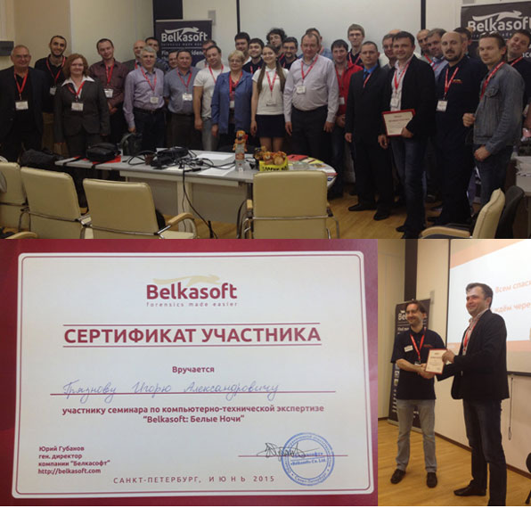 19 июня 2015 года в г. Санкт-Петербург прошел семинар «Белкасофт – Белые ночи». Данный семинар был посвящен вопросам цифровой криминалистики и компьютерно-технической экспертизы. А именно обсуждались вопросы расследования тяжких и особо тяжких преступлений с применением информационных технологий, программного обеспечения «Belkasoft». Программное обеспечение «Belkasoft» специально было разработано отечественными программистами для производства компьютерно-технических экспертиз, компьютерной криминалистики; используется различными отделениями полиции и структурами правопорядка по всему миру. Семинар посетили компьютерные эксперты полиции, ФСБ, ГСУ СК РФ, УФСКН из разных регионов страны. Разработчики «Belkasoft» рассказали о новых возможностях их программного обеспечения. Преподаватель кафедры Судебных экспертиз Грязнов И.А. выступил с докладом «Методические рекомендации по расследованию преступлений, связанных с хищением банковских средств», поделился своим опытом в исследовании мобильных телефонов. За участие в семинаре Грязнов И.А. награжден компакт-диском с дорогостоящим программным обеспечением «Belkasoft» и сертификатом «Belkasoft». Программное обеспечение «Belkasoft» планируется использовать в Юридическом институте для обучения студентов судебной компьютерно-технической экспертизе и производства компьютерных экспертиз.