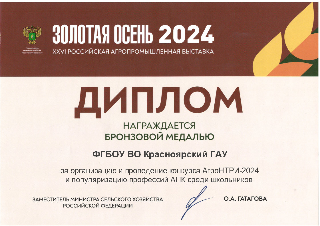 Красноярский ГАУ получил статус региональной площадки Всероссийского конкурса "АгроНТРИ-2024" по следующим номинациям: