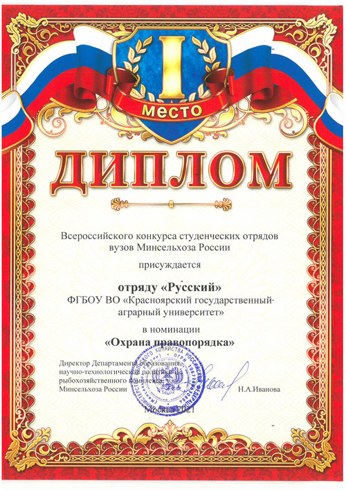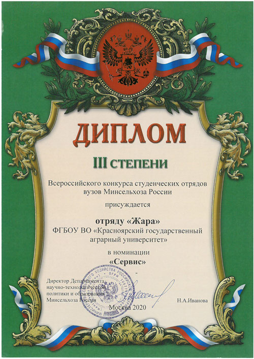 Агентством молодёжной политики и реализации программ общественного развития за особый вклад в развитие студенческих отрядов Красноярского края отмечены комиссар штаба Красноярского ГАУ Иван Моисеев и Анастасия Щеглова, студентка ИПБиВМ.