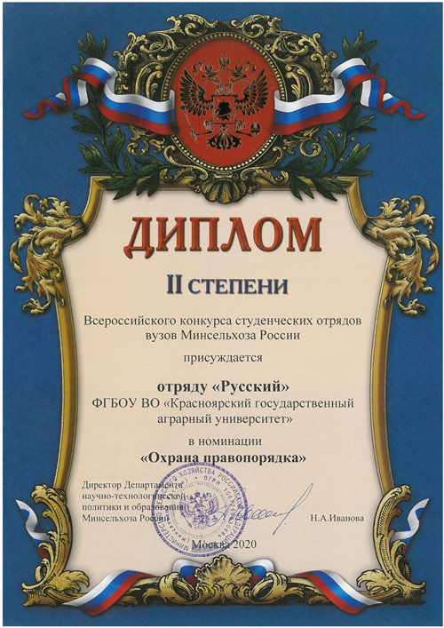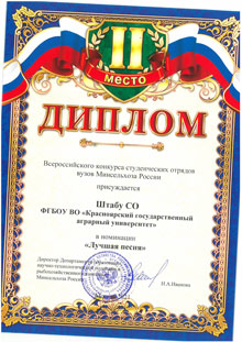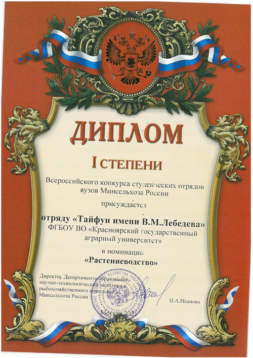 В рамках Юбилейного Всероссийского слёта в Москве Начальник Штаба Владимир Шапов получил из рук Министра сельского хозяйства РФ Оксаны Лут диплом за 2 место в Конкурсе среди образовательных организаций высшего образования на лучшую практику организации деятельности студенческих отрядов в системе образования Министерства науки и высшего образования Российской Федерации.