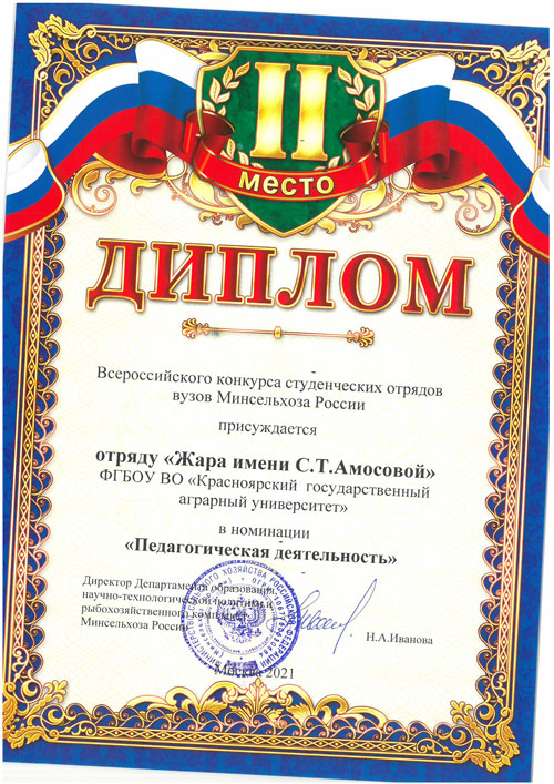 На Всероссийском слёте специализированных отрядов «Итоги трудового семестра 2024» в городе Вологда объявили итоги Всероссийского конкурса аграрных вузов России, где Красноярский государственный аграрный университет занял 2 место в номинации «Лучший вуз, организующий деятельность СО».